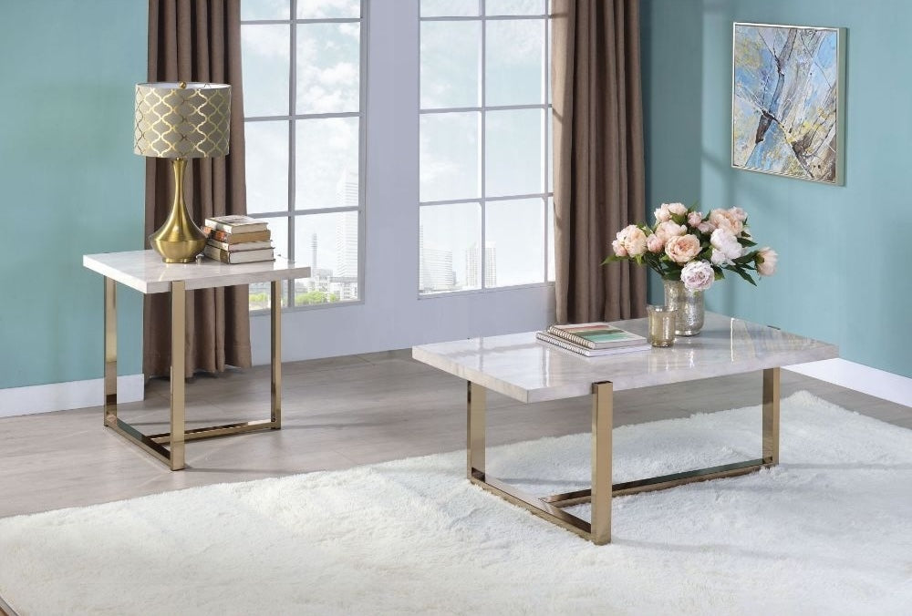 Expertly painted champagne gold "T" shaped base, and faux marble table tops the Feit occasional tables offer a delicate and gorgeous structure. These highly recommended tables will be a prominent furniture piece in any living room with its bright color scheme.