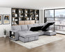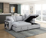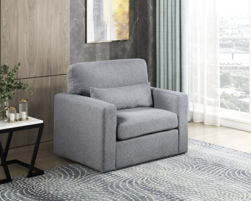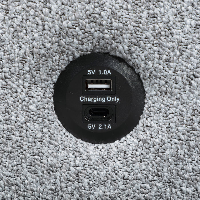 Providing a casual look and plentiful functionality to your living room is the Pompano Collection. The pull-out bed that is stored beneath pops up to create ample space for full leg extension while the lift-top seat of the chaise opens to reveal hidden storage perfect for blankets and pillows. Additional functionality comes in the form of the side mounted shelving units located within the outer face of the side arms and the USB charging ports, allowing you to keep your device close during your time of relaxation. Coordinating seating is provided by the swivel armchair, it’s 360-degree turning radius allowing you to interact with your family and friends. The collection is covered in gray boucle fabric, its neutral tone and satisfying texture a subtle complement to your home’s décor.