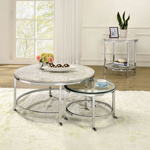 The coffee table stands as a centerpiece, its round form a canvas for the rich, decorative black faux marble that offers the beauty of natural ston...
