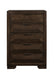 Contemporary design and convenient functionality intersect in the design of the Pilot Collection. Birch veneer is finished in a warm espresso in this unique bedroom offering. Raised panels provide visual interest to the drawer fronts, headboard and footboard. The bookcase headboard provides ample storage and display space as does the storage drawer footboard. Complementing horizontal metal hardware lend additional accent to the case pieces.