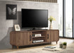 Elevate your living space with this sleek and contemporary entertainment solution that blends modern design with functionality. Featuring a streamlined silhouette and a chic, light wood finish, this piece exudes understated elegance while offering practical storage options. Sliding doors let you alternate between closed cabinets and open shelving, perfect for displaying décor or housing media devices. Enhanced with minimalistic black handles for a touch of contrast, this unit stands on tapered legs, adding a mid-century flair to its aesthetic. Whether you're setting up your home theater or showcasing your favorite accents, this centerpiece effortlessly combines style and utility to create a harmonious and inviting ambiance.