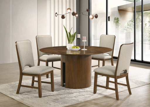 Introducing the Rheinfall transitional dining set, crafted from rubberwood and acacia veneer with fabric-upholstered seats for timeless elegance an...