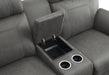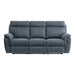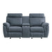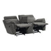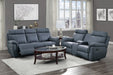 The modern profile of the Clifton Collection serves to provide comfort, function and style to your home’s casual living room. The gray or blue polished microfiber that covers the plush arms and seating of the sofa, love seat and chair lends to the decorative versatility of the collection. The sofa features dual reclining ends and a drop down center seat back with cup-holders and tabletop, the dual glider reclining ends of the love seat – with center console featuring cupholders and storage – and the glider reclining chair all feature manual motion mechanisms operate with the pull of a side-mounted tab, that once engaged, take you from seated to reclined in an easy motion.
