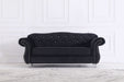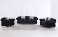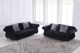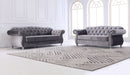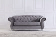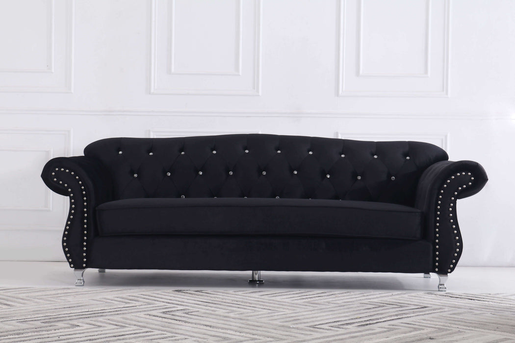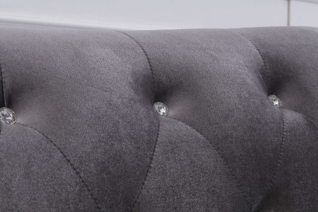 The Sofia is an elegant and flashy stationary living room set. Its fabric is velvety and smooth to the touch. The Sofia has silver coated nailheads on the arms, tufted crystals on the back and chrome legs all contributing to its shiny look. Accent pillows are included with the set.