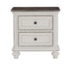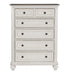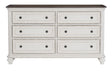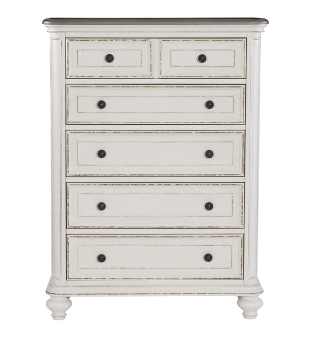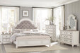 Soft, sweeping curves define the elegant profile of the Baylesford Collection. The bedroom is softened by an antique white rub-through finish with brown-gray finished framed-plank case good tops, creating a romantic aesthetic will place beautifully within your bedroom. Dark gray pleated, button-tufted fabric provides stunning contrast to the look of the bed, while dark finished metal knob hardware provides complementing contrast.