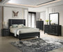 This elegant bedroom collection presents a sophisticated ensemble perfect for creating a refined modern aesthetic in your sleeping quarters. The suite features a sleek, minimalist design with crisp, clean lines and a rich charcoal finish that exudes contemporary charm. Anchoring the set is a robust panel bed with a prominent headboard, promising a sturdy and stylish centerpiece. Flanking the bed are complementary case pieces, offering ample storage with their smooth-gliding drawers accented with chic silver-toned hardware.