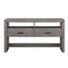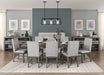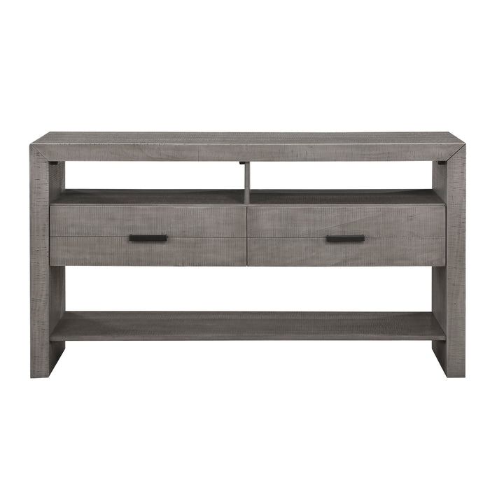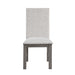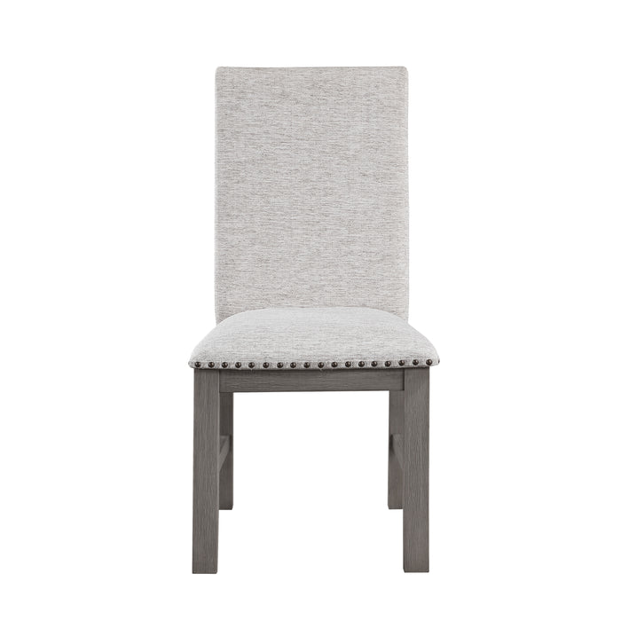 At the intersection of modern and rustic design, the Gresham Collection brings you to a full stop. Clean lines are paired with the natural beauty of acacia veneer, while a gray finish lends neutral versatility to the décor of your casual dining room. The rustic look of the plank tabletop is interrupted by the modern lines of the table apron’s angled edge. Coordinating side chairs feature wood legs and gray fabric upholstered seats, with profile-defining nailhead trim. The open display shelving of the server further lends to the modern look of the collection while providing drawer storage for your tabletop décor.