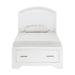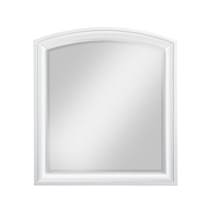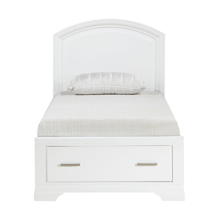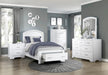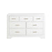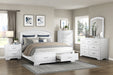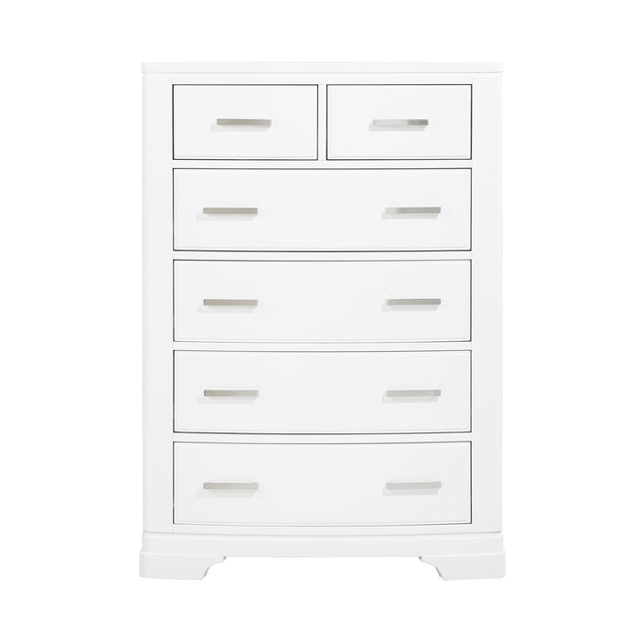 The intersection of modern lines and understated transitional style blend to create the Hudson Collection. Available in a white finish, the collection presents a decoratively versatile addition to your bedroom. Polished chrome bar hardware fronts the dresser, chest, nightstand, and storages drawers of the bed’s footboard. The curved design of the bed’s headboard carries over to the top rail of the mirror.