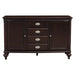 Refined elegance is exemplified in the design of the Marston Collection. With three available table options, there is a perfect match for your home – A double pedestal base rises to support the clipped-corner rectangular tabletop of the 96-inch table is flanked by chairs that feature turned front legs and nail head accent, along with a neutral tone fabric that covers the seats and backs. In support of the collection are the functional china and server. Featuring drawer and door storage, each with polished chrome tone cup pull and knob hardware, you can be assured of plentiful space in which to stow or display your tabletop décor. The server also features a black melamine laminated top.