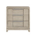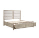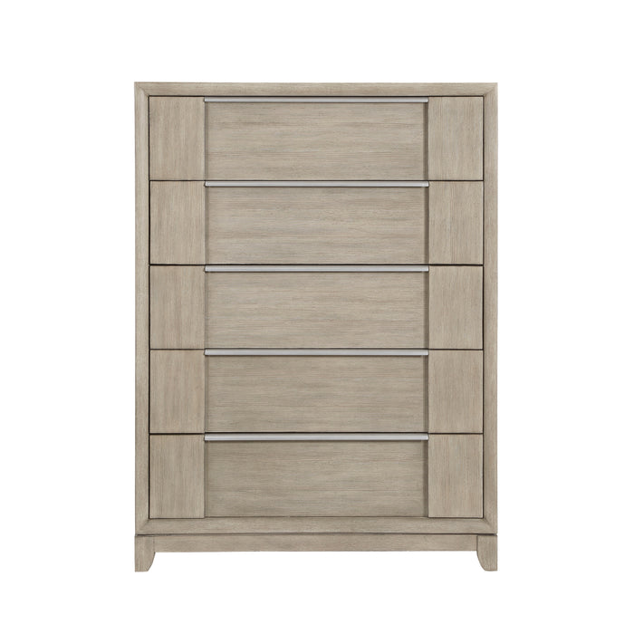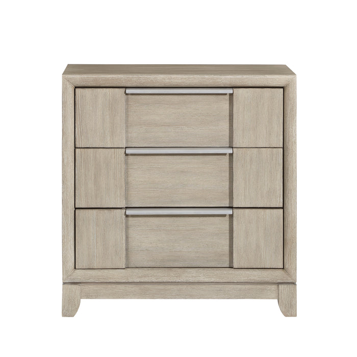The sophisticated modern styling of the McKewen Collection brings refined design to the elegant space of your bedroom. The collection features ash veneer, which features a light gray finish that perfectly complements the neutral tone of the headboard’s fabric and the horizontally mounted, pewter-finished, metal hardware that centers each of the footboard’s drawers, as well as the drawers of the dresser, nightstand, and chest. Additional storage pace for your bedroom comes in the form of the footboard drawers.