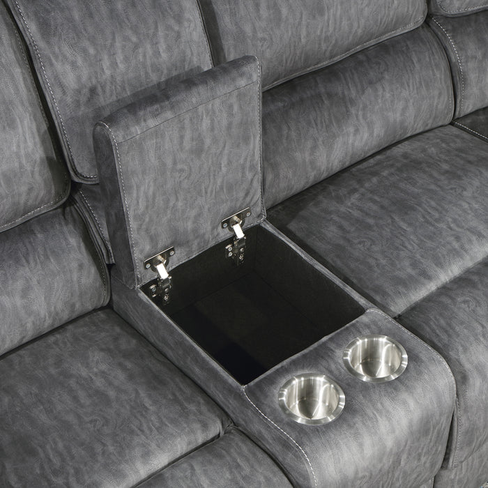 With a versatile style that is perfect for your casual living room, the Muirfield Collection’s plush seating and modern aesthetic create a platform for your relaxation. The plush pillow-top arms and seating of the sectional is covered in gray textured microfiber for neutral accent to your home’s decor. The left side seating of the sectional features a center console, its cupholders and hidden storage providing functional convenience to the group. The end chairs of the sectional feature manual-motion mechanisms that are operate with the pull of a side-mounted tab, taking you from seated to reclined in an easy motion.