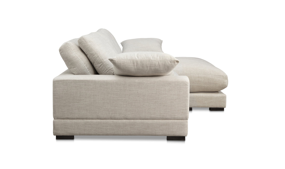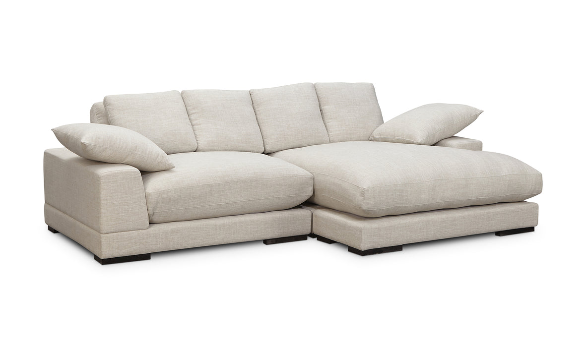 A fusion of comfort and elegance with clean lines and plush cushions, the Plunge sectional is masterfully crafted to maximize space and provide unparalleled relaxation. Its versatile flip chaise feature allows a left or right-side orientation that effortlessly adapts to create a sanctuary of style and repose, while its improved channeling and filling distribution ensures soft landings and comfort for years to come.