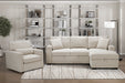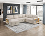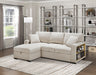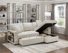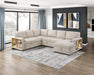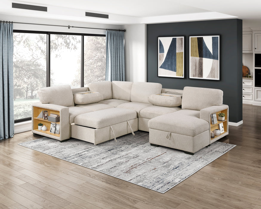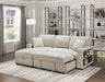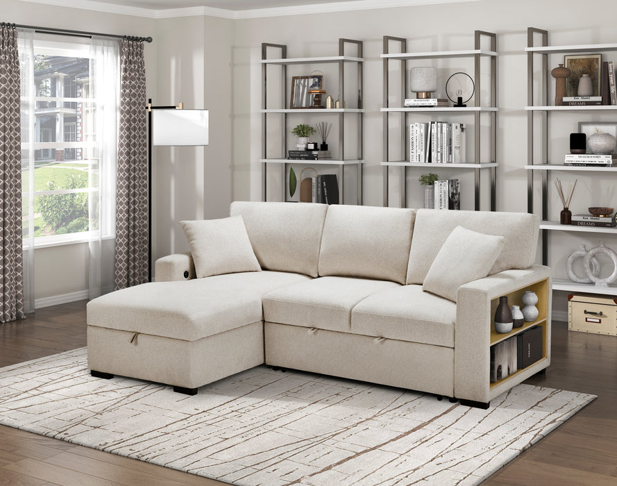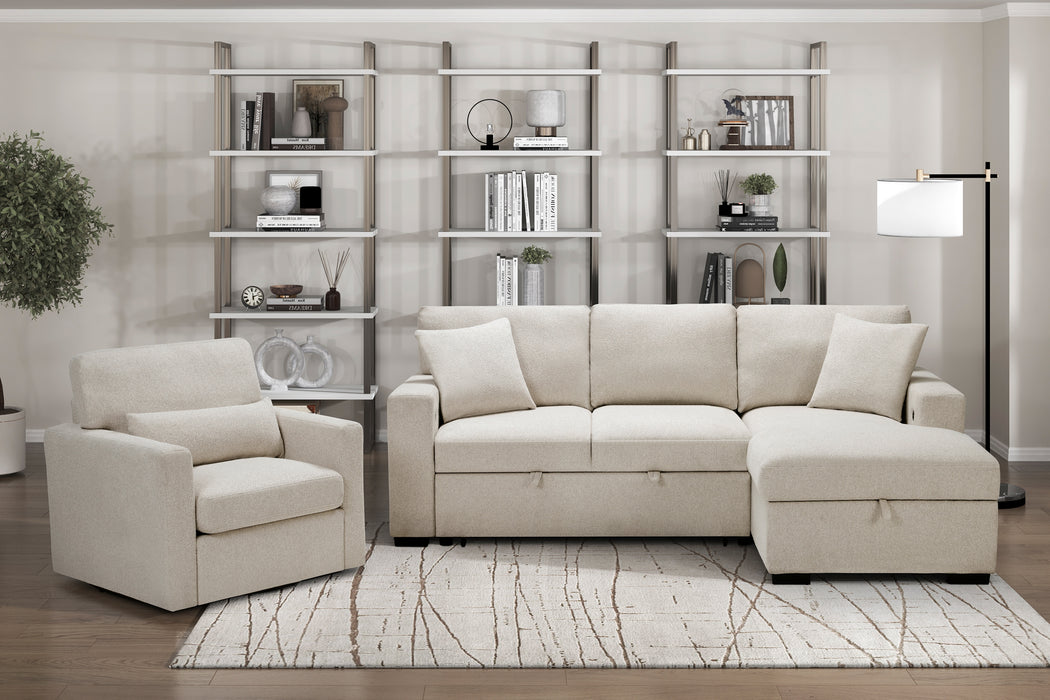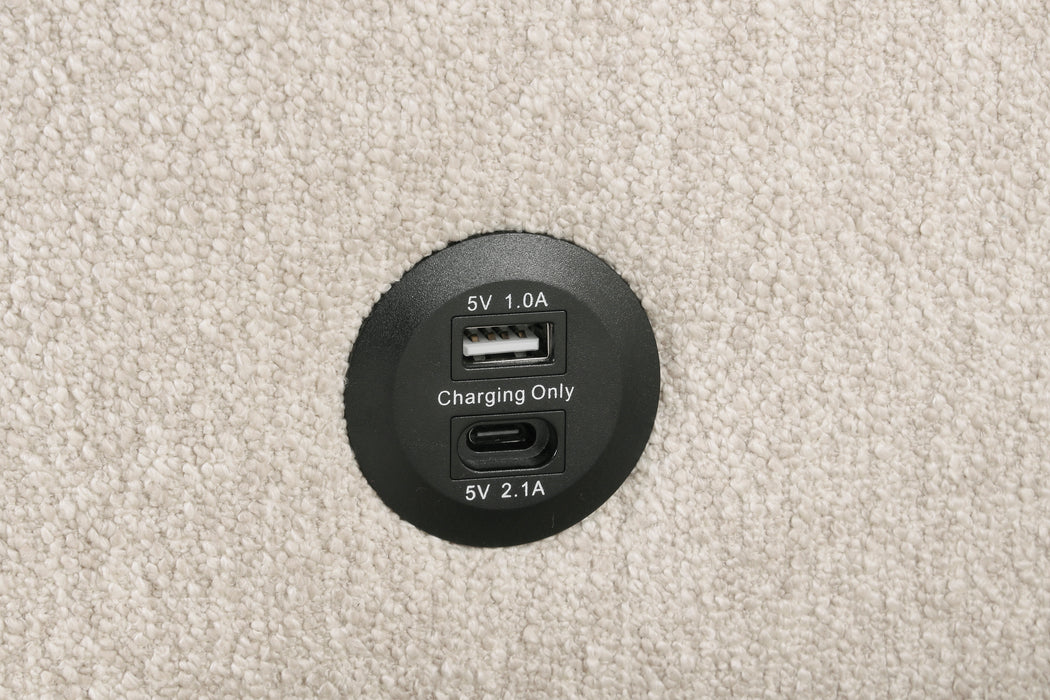 Providing a casual look and plentiful functionality to your living room is the Pompano Collection. The pull-out bed that is stored beneath pops up to create ample space for full leg extension while the lift-top seat of the chaise opens to reveal hidden storage perfect for blankets and pillows. Additional functionality comes in the form of the side mounted shelving units located within the outer face of the side arms and the USB charging ports, allowing you to keep your device close during your time of relaxation. Coordinating seating is provided by the swivel armchair, it’s 360-degree turning radius allowing you to interact with your family and friends. The collection is covered in beige boucle fabric, its neutral tone and satisfying texture a subtle complement to your home’s décor.