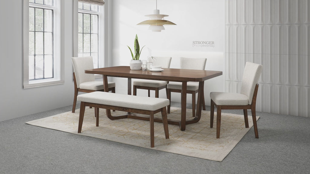 Elevate your dining space with this sleek and sophisticated dining set, designed to seamlessly blend modern elegance with mid-century inspiration. The beautifully crafted table features a warm wood finish and a unique sculptural base, adding a refined touch to any setting. Complementing the table, the gracefully curved chairs and bench boast plush upholstered seats and soft fabric backrests, ensuring superior comfort for every meal. With its clean lines and timeless design, this dining collection is perfect for those who appreciate both form and function, making every gathering a stylish and inviting experience.
