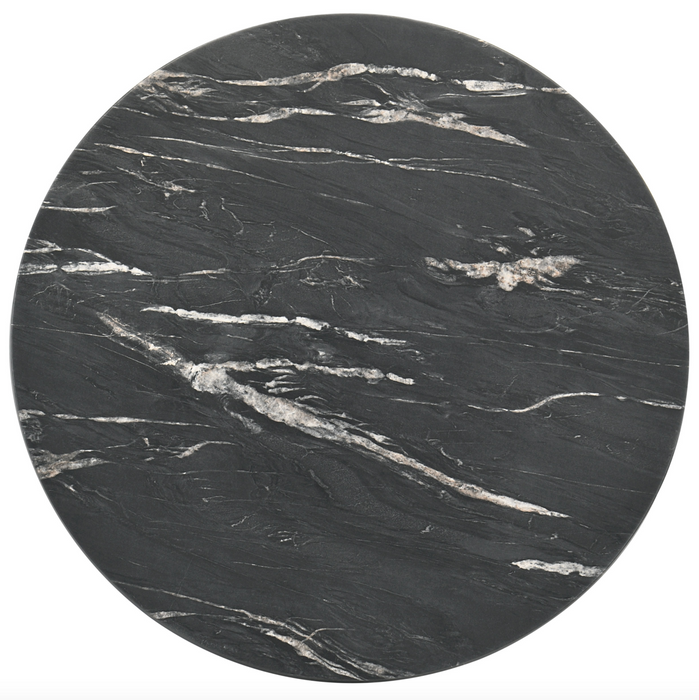 The coffee table stands as a centerpiece, its round form a canvas for the rich, decorative black faux marble that offers the beauty of natural stone with none of its fragility. The high-pressure laminate surface is a triumph of design, melding high durability with ease of maintenance, a savvy choice for the modern home. Its solid wood base, sculptural in its form, lends a steadfast quality, while the marriage of the materials speaks to a sophisticated taste. This piece is a gathering spot for loved ones and a testament to smart living, where style and practicality are in perfect harmony.