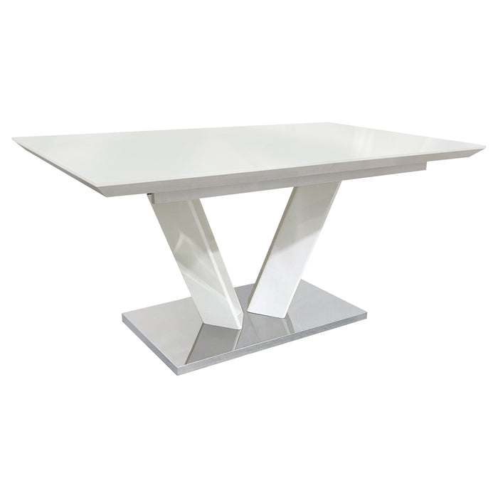 Sleek contemporary styling provides the platform from which you will create your casual dining space in the Yannis Collection. Ultra-bright high gloss finish of the tabletop and V-shaped support provides a distinct contrast to the high polish chrome base plate. The continuous base of the accenting chairs rises to support gray bi-cast vinyl seats with diamond pattern stitching providing additional visual interest. A smooth glide system opens with ease to reveal the self-storing butterfly leaf.